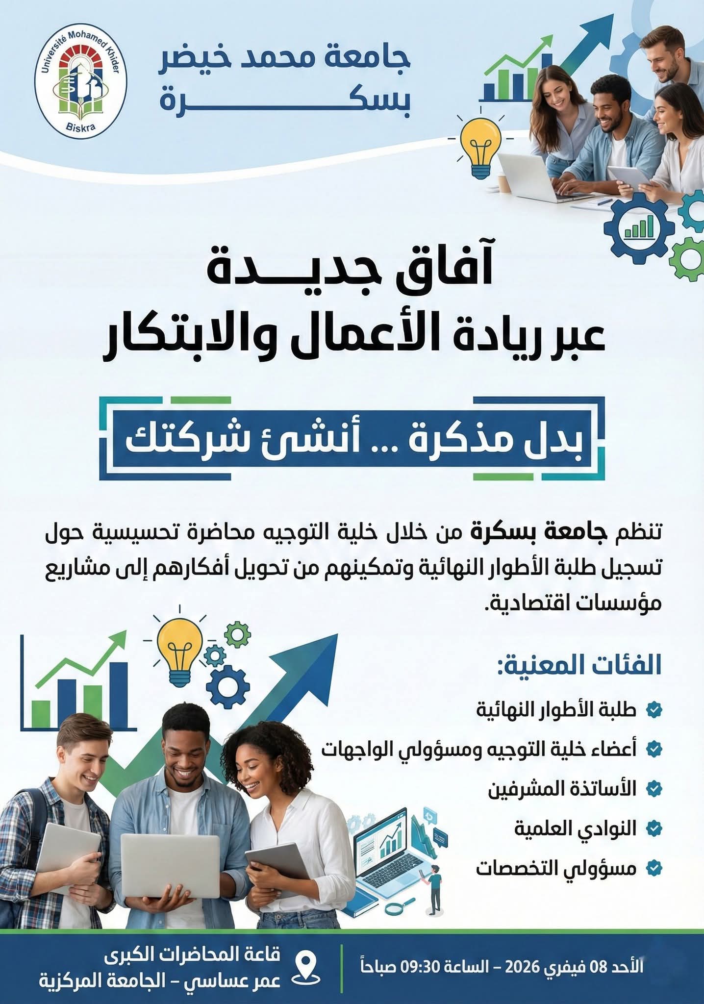 في إطار تعزيز آليات التقييم الذاتي والارتقاء بجودة الاداء المؤسساتي، احتضنت جامعة بسكرة، صبيحة يوم الاربعاء 04 فيفري 2026، اجتماعا تنسيقيا لخلية ضمان الجودة، برئاسة الاستاذ كحلول العيد، خصص لمتابعة مدى تقدم التحضيرات المتعلقة بعملية التقييم الذاتي، وبحث سبل تحسين الاستبيان ومواءمته مع متطلبات المواصفة الدولية ISO 9001، مع التشديد على اهمية التنسيق والعمل الجماعي لانجاح العملية وتحقيق اهداف الجودة داخل الجامعة.
