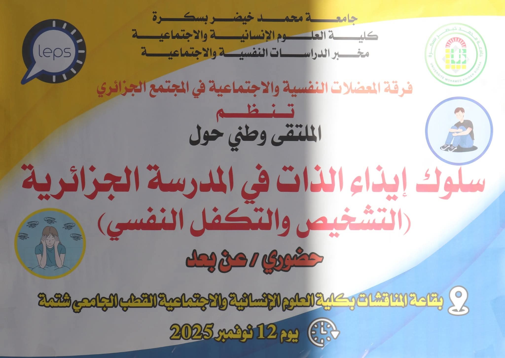 احتضنت قاعة مناقشات كلية العلوم الانسانية والاجتماعية لجامعة بسكرة بالقطب الجامعي شتمة صبيحة يوم الاربعاء 12 نوفمبر 2025 اشغال الملتقى الوطني الموسوم بـ "سلوك ايذاء الذات في المدرسة الجزائرية.. التشخيص والتكفل النفسي" الذي يشرف على تنظيمه مخبر الدراسات النفسية والاجتماعية.