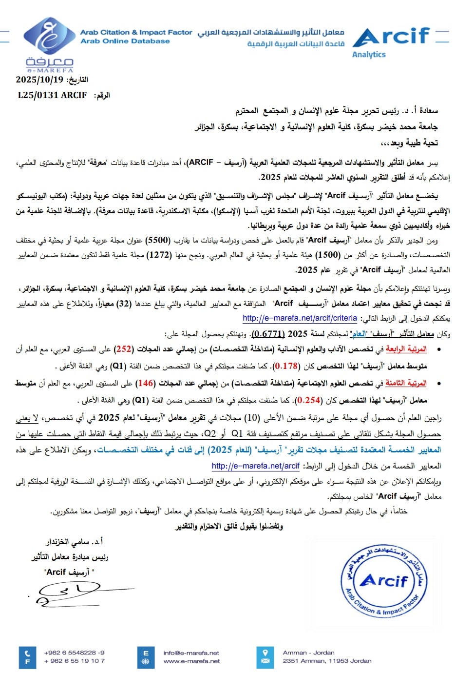 وذلك بمناسبة نجاحها في تحقيق معايير اعتماد معامل التأثير والاستشهادات المرجعية العربي "آرسيف Arcif" المتوافقة مع المعايير الدولية، وما أسهمت به هذه المجلات من دور فاعل في تمكين جامعة بسكرة من تحقيق المرتبة العاشرة عربيًا في تصنيف المجلات العلمية العربية.