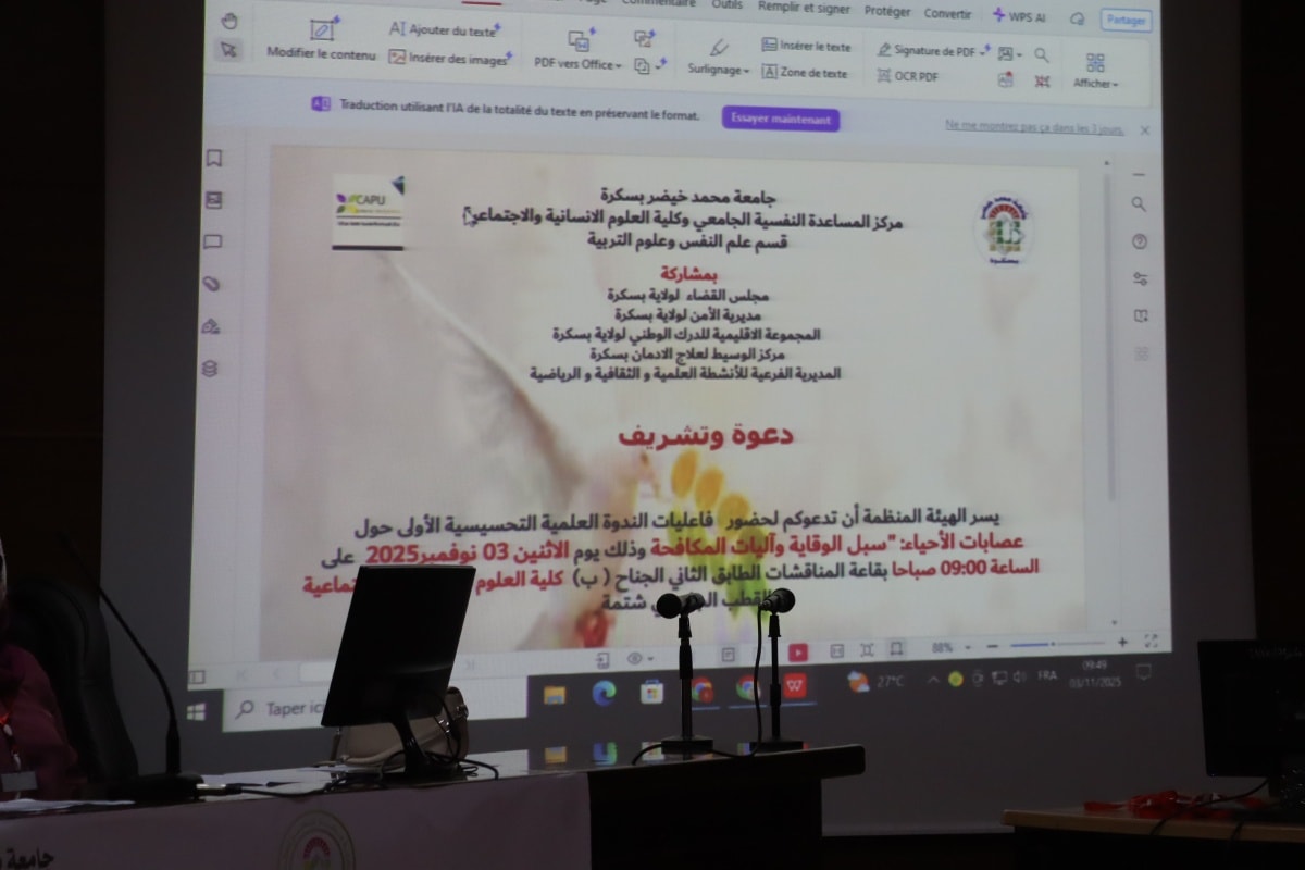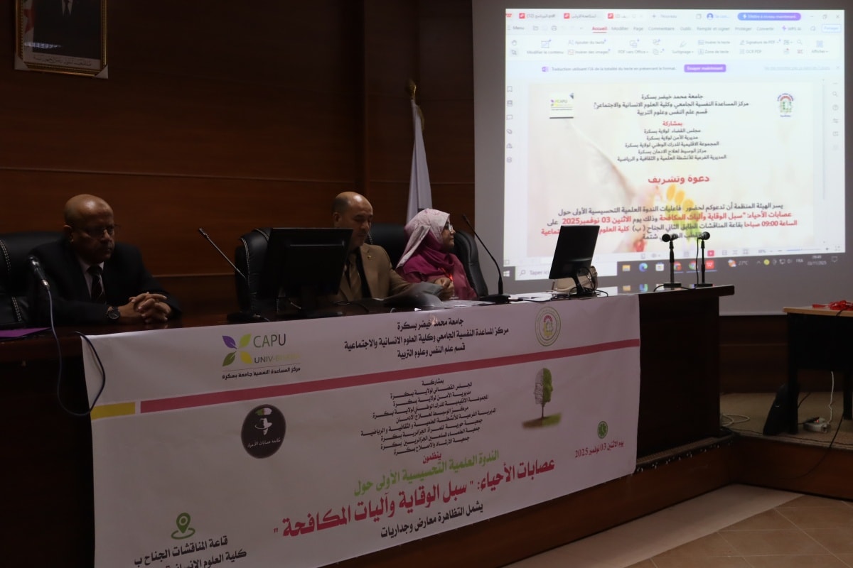 في ظلّ التحديات الاجتماعية والأمنية التي تشهدها المجتمعات المعاصرة، وسعي الجامعة إلى الاضطلاع بدورها في التوعية والتوجيه، نظمت كلية العلوم الإنسانية والاجتماعية بجامعة محمد خيضر بسكرة بالتنسيق مع مركز المساعدة النفسية الجامعي وقسم علم النفس وعلوم التربية، يوم الاثنين 03 نوفمبر 2025، الندوة العلمية التحسيسية الأولى حول عصابات الأحياء: "سبل الوقاية وآليات المكافحة"، بقاعة المناقشات (المدرج ب) بالقطب الجامعي شتمة.